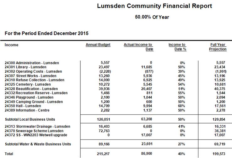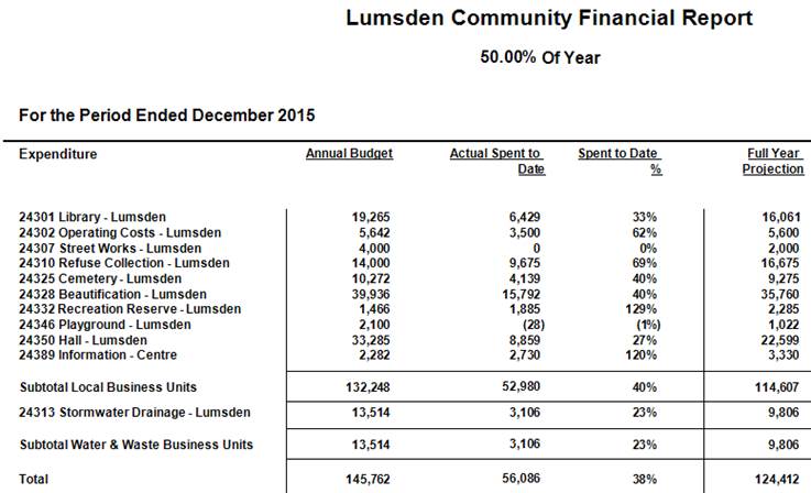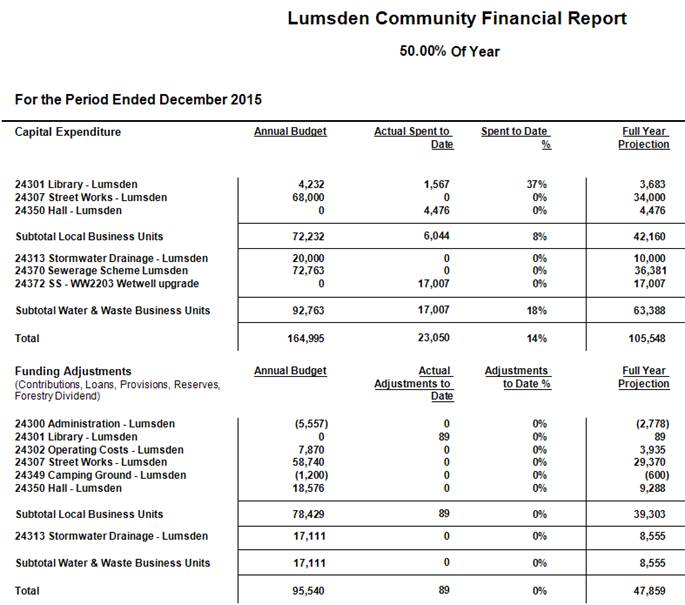 7.2 Works and Finance Report to Lumsden Community Development Area Subcommittee for the period ended 31 December 2015 15