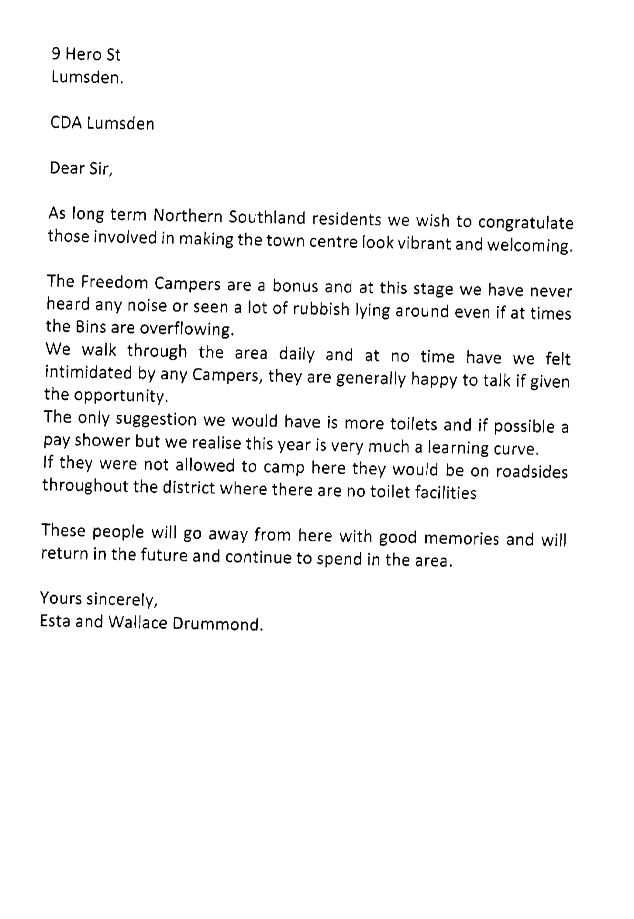 1 Communication from Esta and Wallace Drummond, 9 Hero Street, Lumsden wishing to express their support for the Freedom Camping site at the former Railway Station, Lumsden.