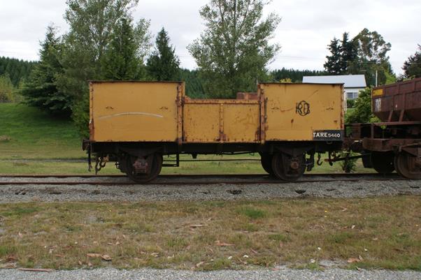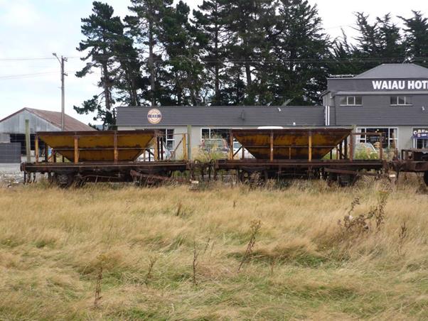 These wagons were adapted from NZ Railways underframes. They have moderate heritage value. Currently they are in good condition although rusty. They will last a long time outdoors however a coat of protective paint would help to preserve them and would improve their appearance. These were loaned to Oamaru Steam and Rail Restoration Society in 1990 and returned in 2002. Two of the wagons are currently leased out to Colin Brown for a term of 33 years (from 1 November 2009) for a static display at Tuatapere. Colin Brown also took the third one when he removed the other two wagons. Two of the wagons are still at Tuatapere and one at Fairfax. Colin is putting a flat deck on the wagon at Fairfax and taking the gravel hopper off.