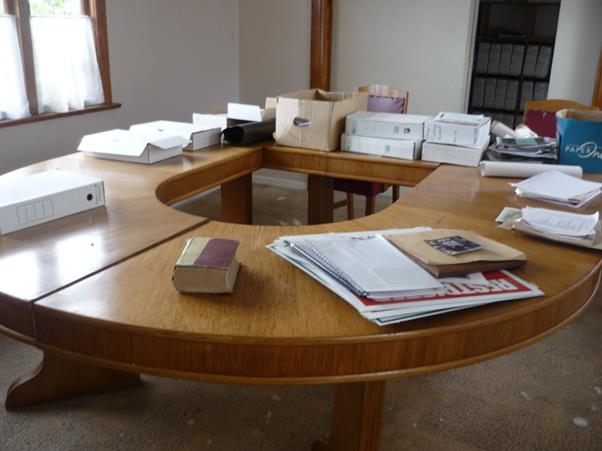These are the original boardroom table and chairs used by the Ohai Railway Board. Five out of the nine original chairs are accounted for and are stored in the old Boardroom in the Ohai Railway Board office building. The table is in good condition and the chairs are in poor condition. Two red chairs used later by the Board are also in the room and are in good condition. The Boardroom table was initially retained by the Council after the railway, land and buildings were sold to NZ Railways but then later sold to Rugby Southland (year unknown). Rugby Southland donated the table back to the Ohai Railway Board Heritage Trust for their Museum project. As part of the dissolution of the ORBHT any donated items must be offered back to the donors however Rugby Southland have confirmed that they do not want the table to be returned and that Council can regain ownership of it.