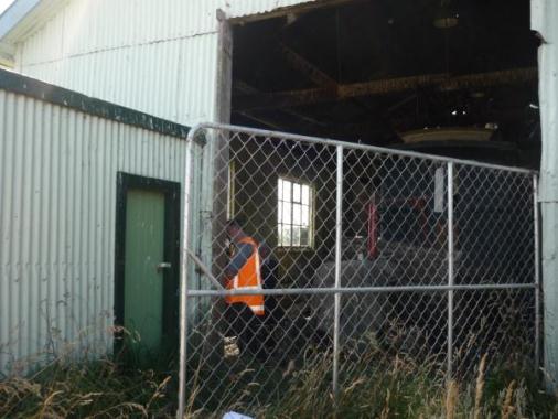 As previously mentioned carriage A525 is being targeted by vandals. A number of the windows have been smashed (occurring sometime between October 2013 and now) and although the vandals have not found their way into the carriage (the doors are locked) it may only be a matter of time before they find a way. Carriage A525 is stored in a shed with a David Brown tractor and landcruiser which has also had its windows smashed. The shed is secured by a deer fence which is locked (see photo below). There are a few options which could be explored to improve security including removing the carriage to another site until a new home for it is found (there is currently no room in any of the other sheds on the Wairio site) or try to improve the security at the entrance of the shed (blocking off the gap above the deer fence).
